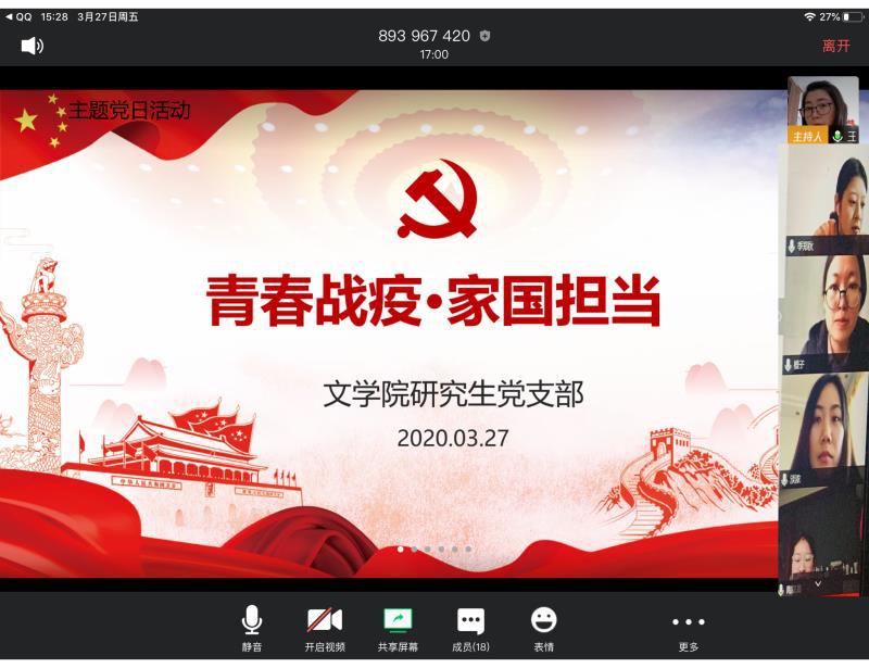 3月27日下午,365英国上市公司在线研究生党支部利用微信与腾讯会议网络平台开展了一场特别的线上主题党日活动,活动以“青春战疫·家国担当”为主题,学习习近平总书记关于抗疫的相关指示,探讨当代大学生的家国使命担当。