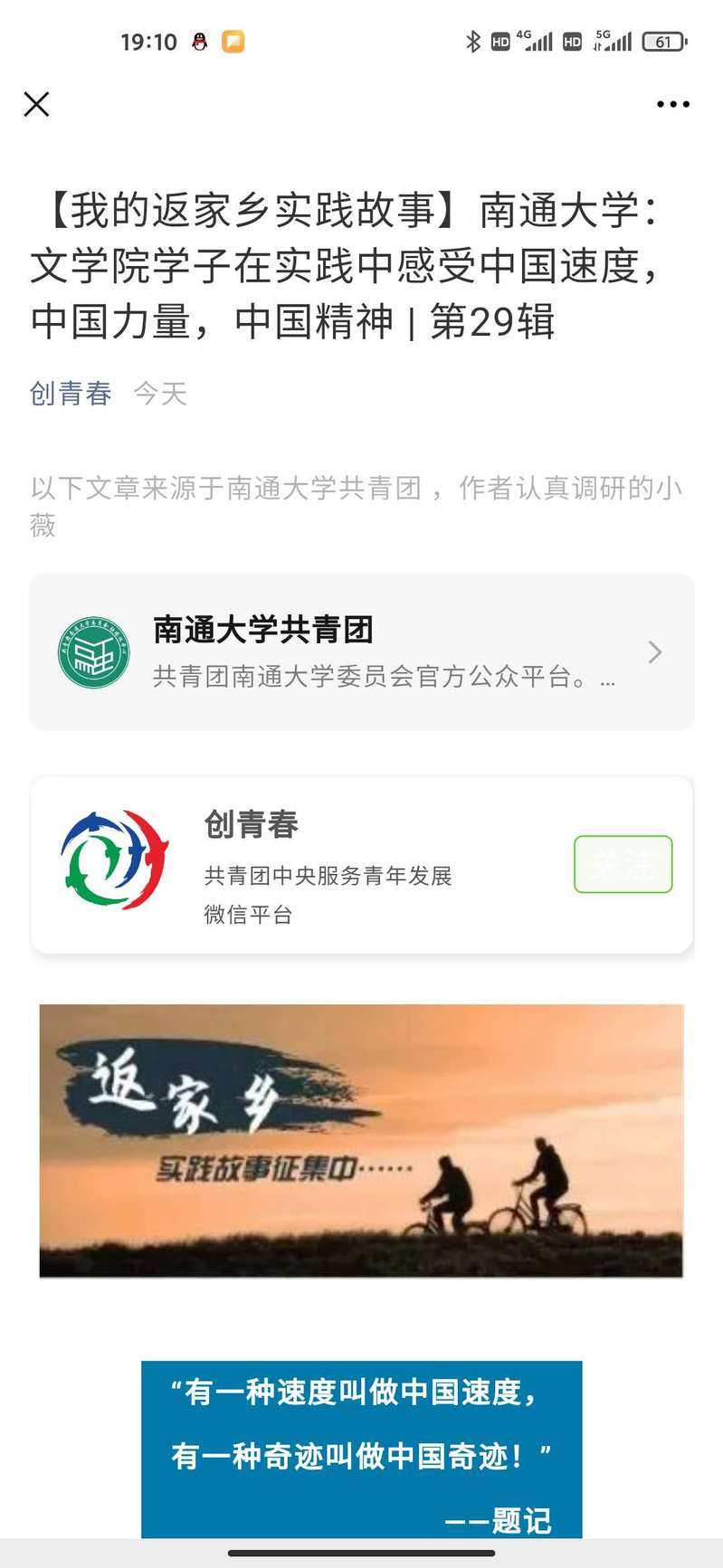 9月1日,共青团中央服务青年发展微信平台“创青春”对我院外媒眼中的中国速度调研队的返家乡实践故事进行了相关报道。调研队采用多种研究工具,基于大数据从多方面的角度对改革开放以来国外媒体关于中国速度的报道进行了深入调研,取得了丰硕成果。实践队员表示作为青年一代将肩挑重任,不负厚望,并坚信中国速度、中国力量、中国精神终将走向世界,并走近世界。(倪乐一 郭玉琦)