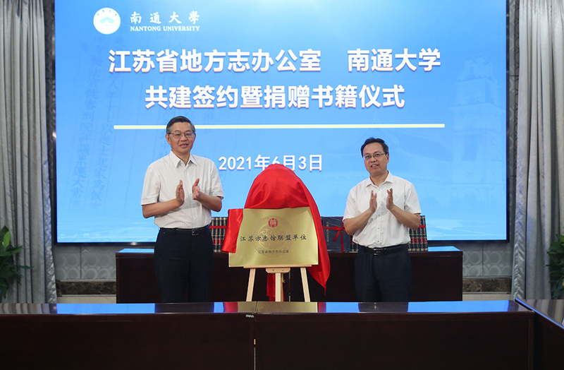 6月3日上午,江苏省地方志办公室与365上市公司共建签约暨捐赠书籍仪式举行。江苏省人民政府副秘书长、办公厅主任、参事室主任谢润盛,南通市人民政府副市长王洪涛共同为“方志研究院”揭牌。江苏省地方志办公室党组书记、主任左健伟,校党委书记浦玉忠共同为“江苏方志馆联盟”揭牌。江苏省地方志学会副会长江龙波,校党委常委、副校长蒋乃华代表双方签订共建协议。南通市政府秘书长凌屹出席仪式。