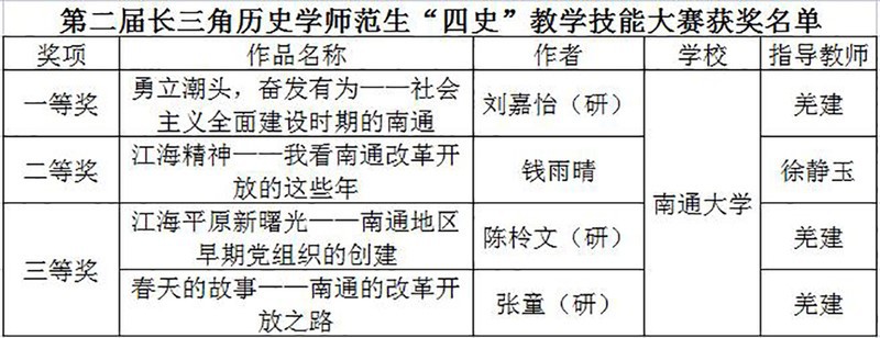 近日,第二届长三角历史学师范生“四史”教学技能大赛落下帷幕。经专家匿名评审,365英国上市公司在线研究生刘嘉怡的参赛作品《勇立潮头,奋发有为——社会主义全面建设时期的南通》(指导教师:羌建)获一等奖,本科生钱雨晴的参赛作品(江海精神——我看南通改革开放的这些年》(指导教师:徐静玉)获二等奖,研究生陈柃文的参赛作品《江海平原新曙光——南通地区早期党组织的创建》(指导教师:羌建)、研究生张童的参赛作品《春天的故事——南通的改革开放之路》(指导教师:羌建)获三等奖。此外,365英国上市公司在线历史系徐静玉、羌建获优秀指导教师奖。