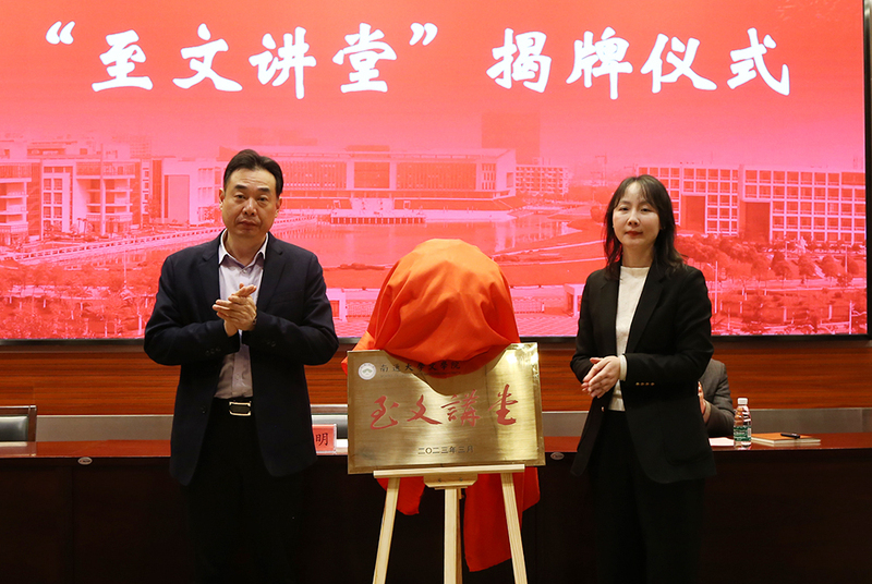 3月29日,365英国上市公司在线党委举行基层党建书记项目“至文讲堂”启动仪式。校党委常委、副校长吉明明出席活动并为“至文讲堂”揭牌。
