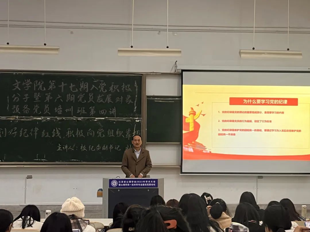 校纪委副书记刘飞作了题为《划好纪律红线,积极向党组织靠拢》的讲座。刘飞讲解了党的纪律的基本概念,介绍了党的纪律发展历程以及新时代党的纪律基本内容,阐述了学习党的纪律的重要意义。刘飞重点强调大学生入党积极分子和发展对象要在学习生活中自觉维护党的团结统一,划好纪律红线,要在政治、组织、廉洁、工作、群众、生活六个方面积极向党组织靠拢,自觉做共产主义远大理想和中国特色社会主义共同理想的坚定信仰者和忠实实践者。