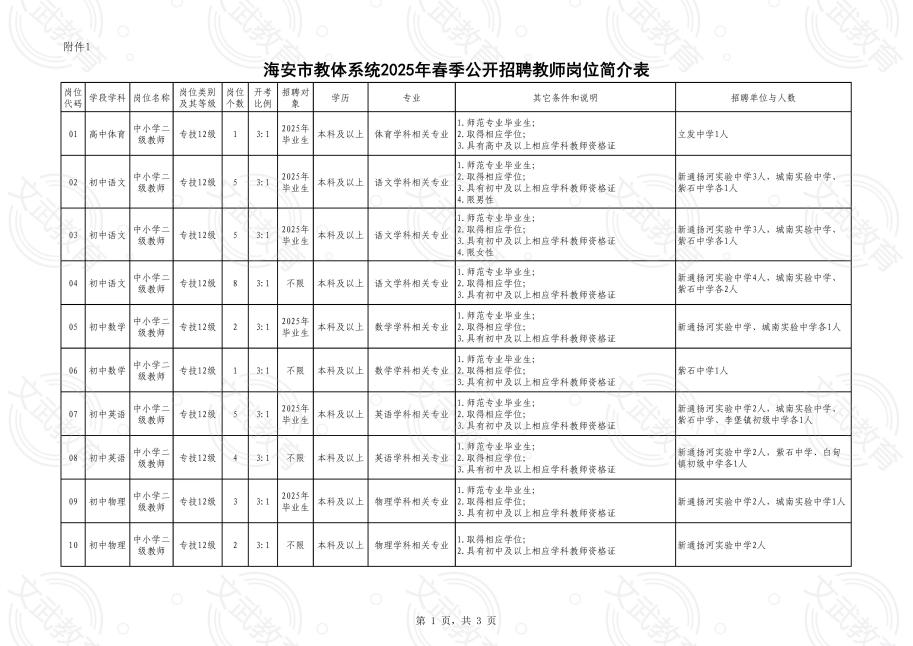 招聘岗位及各岗位招聘条件等详见《海安市教体系统2025年春季公开招聘教师岗位简介表》(附件1,以下简称《岗位简介表》)。《岗位简介表》可在南通市人力资源和社会保障网、海安市人民政府网、海安教育信息网查询。